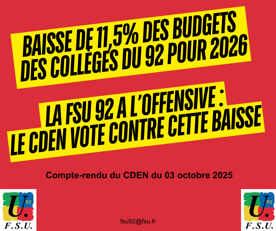 Vendredi 03 octobre 2025, s’est tenu le CDEN (Conseil Départemental de l’Education Nationale) des Hauts-de-Seine, dont l’ordre du jour contenait le vote quant au projet de budget pour les collèges publics du département pour l’année 2026.