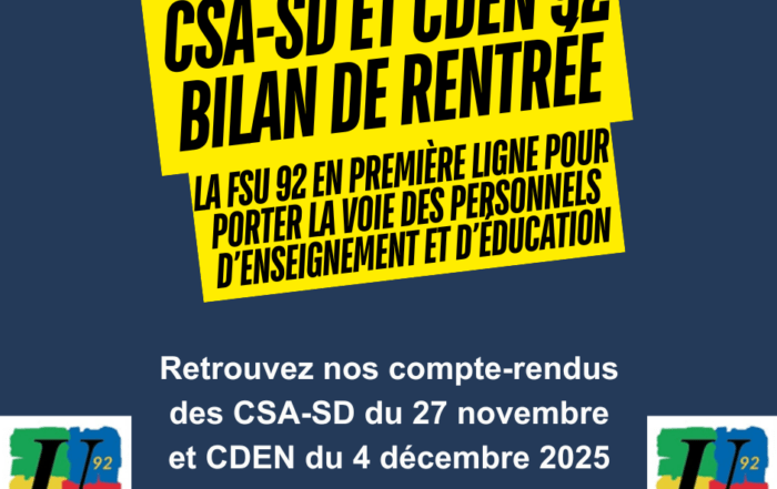 Le jeudi 27 novembre 2025, se tenait le CSA spécial départemental des Hauts-de-Seine portant sur le bilan de rentrée. L'occasion pour vos représentant.es de la FSU de porter toutes les difficultés rencontrées dans les écoles,[...]