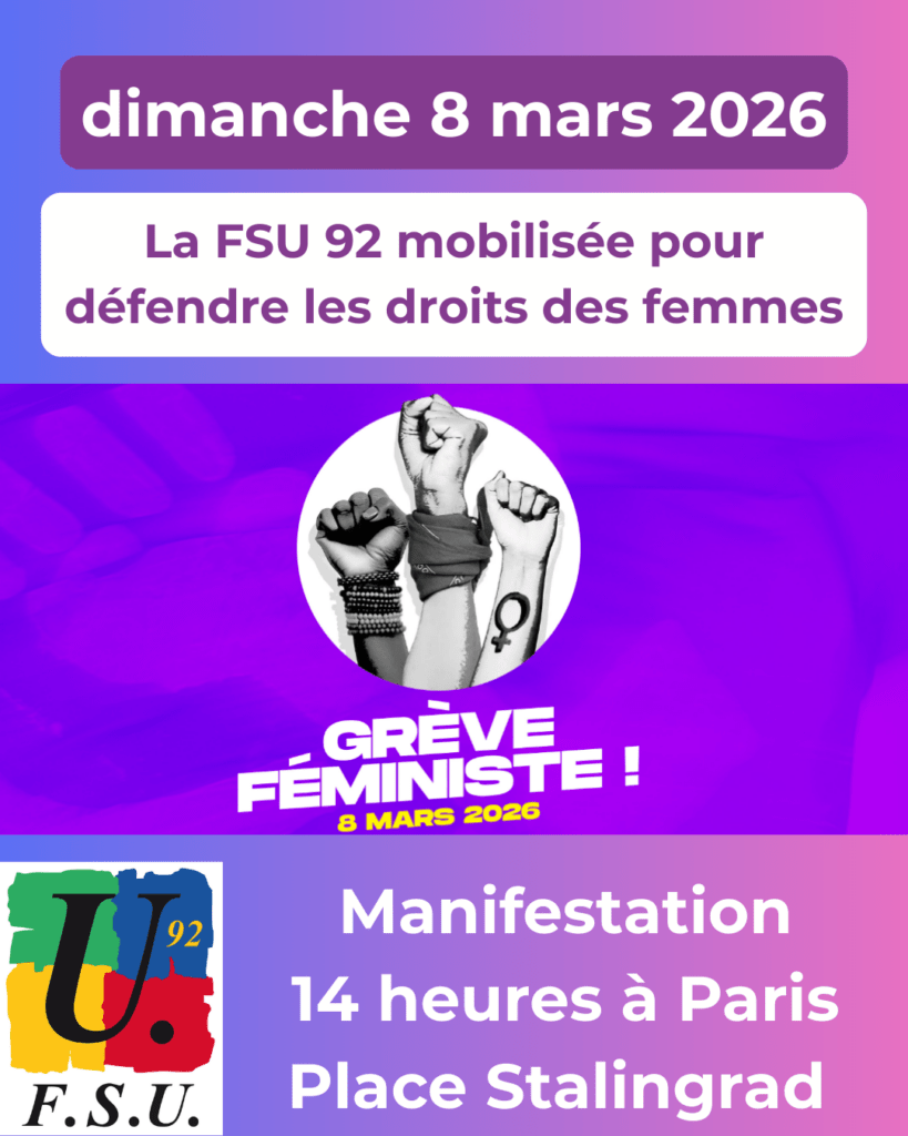 Le dimanche 8 mars 2026, la FSU 92 vous appelle à rejoindre le cortège « grève féministe », collectif auquel la FSU appartient, à l’occasion de la journée internationale pour les droits des femmes.